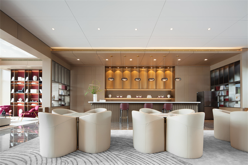 藝術和自然總能在某個節點美妙結合。陽光透過玻璃帷幕躍進室內,將花型裝置渲染得明亮生動。溫潤內斂的淺色系大理石,在燈光的映襯下,與銅色金屬碰撞出輕奢質感。洽談區延續了雅致、輕奢的質感,用金屬、木質、大理石、玻璃、皮、布藝等材質打造空間的豐富體驗,利用材質的軟與硬、剛與柔對比出空間的層次感。