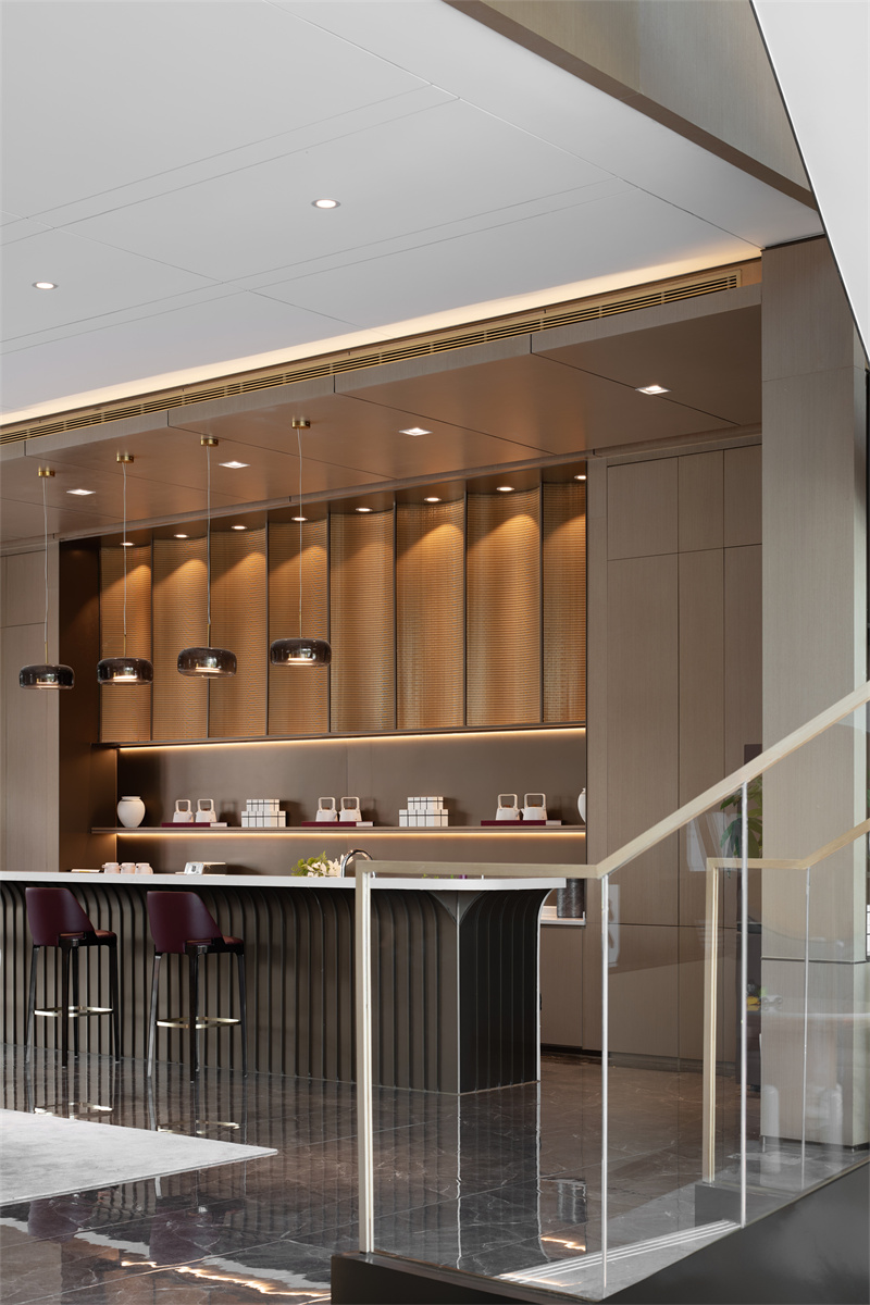 空間運用大面積木色墻面與灰色系瓷磚、局部以沉穩的褐色與柔媚的紅色調和,傳遞出現代、優雅、奢貴的氣質。水吧金屬波紋背景墻和玻璃吊燈,把水之美展現地淋漓盡致,創造多層次的感官體驗。