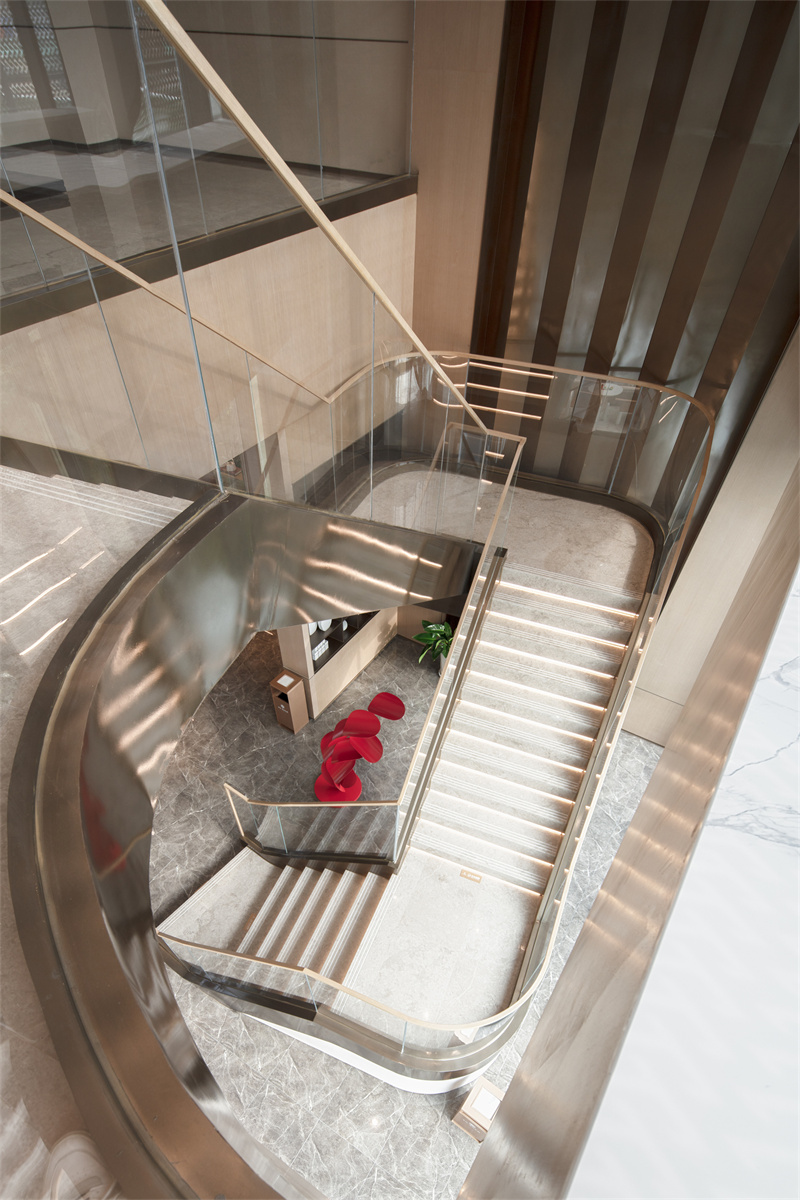 不遠處的藝術樓梯,讓另一側的景觀不再單調。玻璃、金屬扶手,高級冷艷,白色大理石踏步、金屬包邊,陽光與燈光交相輝映,在樓梯上描摹出水的波紋,讓通往二層的樣板區空間更具儀式感。