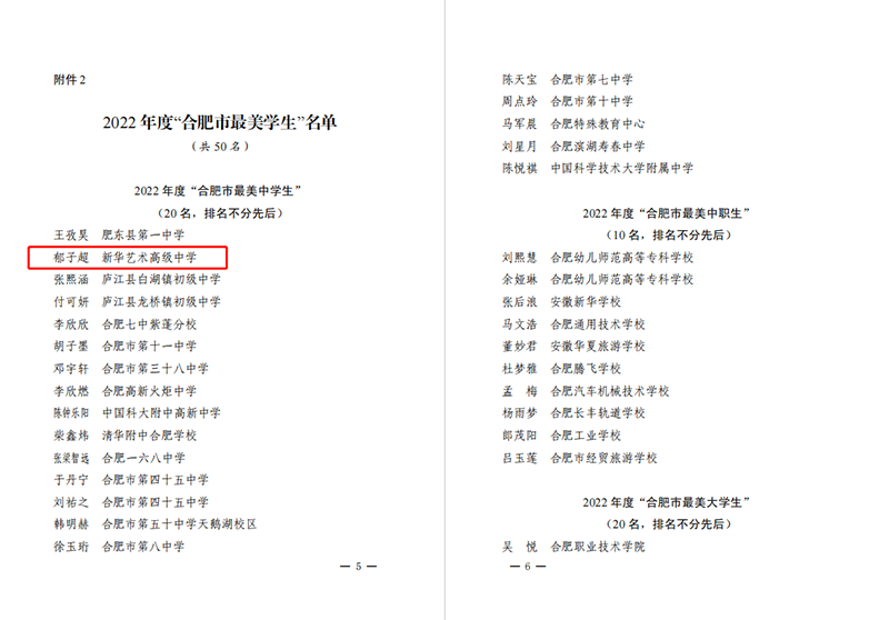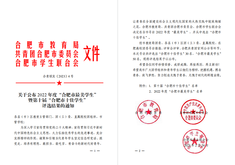 為深入學(xué)習(xí)宣傳貫徹黨的二十大精神,宣傳貫徹習(xí)近平新時(shí)代中國特色社會(huì)主義思想,大力弘揚(yáng)優(yōu)秀學(xué)生的先進(jìn)事跡,充分發(fā)揮榜樣的作用,近日,由合肥市教育局、共青團(tuán)合肥市委員會(huì)、合肥市學(xué)生聯(lián)合會(huì)聯(lián)合開展的2022 年度“合肥市最美學(xué)生” 暨第十屆“合肥市十佳學(xué)生” 評(píng)選結(jié)果出爐。我校高二(1)班郁子超同學(xué)獲評(píng)“合肥市最美中學(xué)生”稱號(hào)!