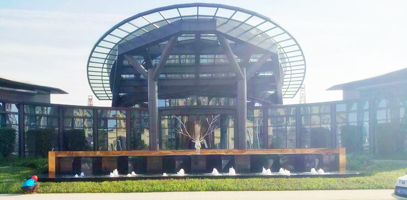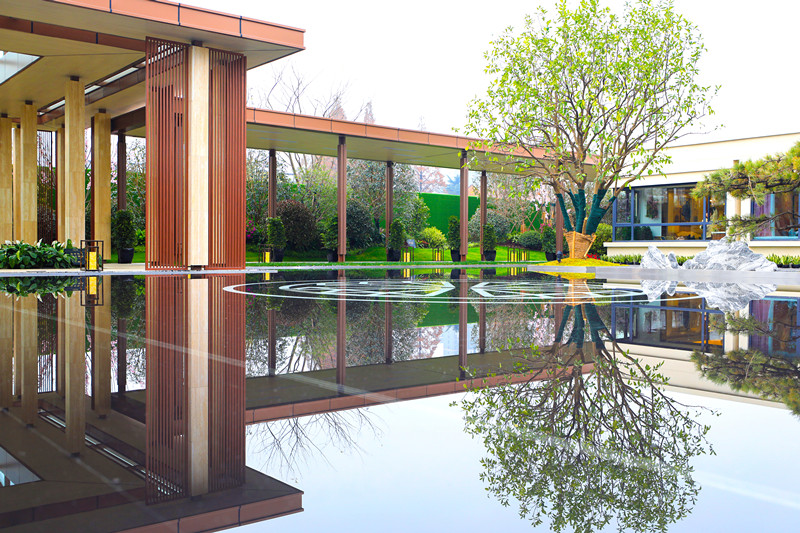 入戶處,緩緩流動的水池如娟娟細流、栩栩如生的雕塑如麋鹿漫步、青蔥翠綠的灌木如山間野花,閉上眼,仿佛踏入了原始森林,神秘而寧靜。