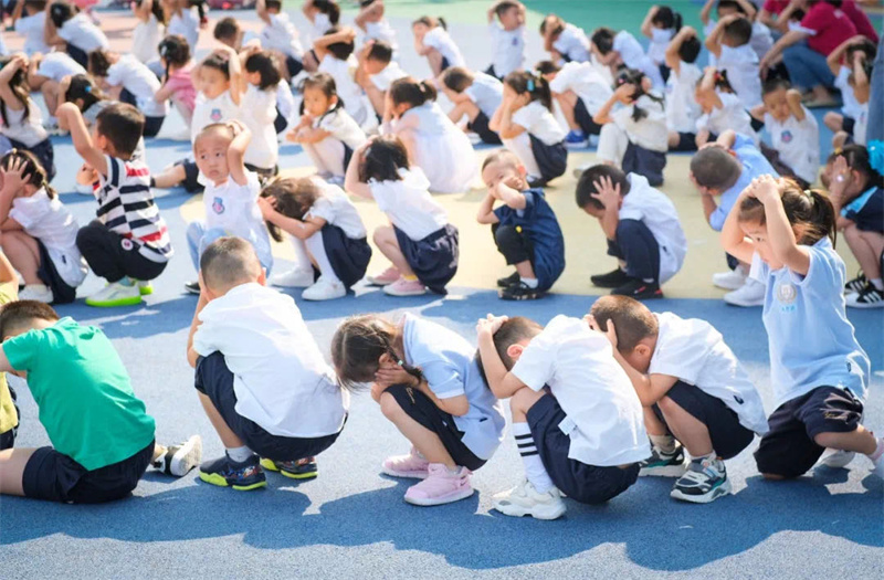 之后在凄厲的空襲警報聲中,大家立即抱頭蹲下或快速就近躲避,以防傷害。解除警報悠悠響起后,班級教師按照預定位置集中整隊,清點學生人數,匯報疏散情況,演練順利完成。