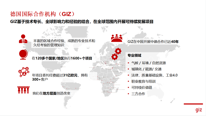 德國(guó)國(guó)際合作機(jī)構(gòu)(GIZ)是一個(gè)在全世界范圍內(nèi)致力可持續(xù)發(fā)展的國(guó)際合作非營(yíng)利組織,擁有豐富的區(qū)域合作經(jīng)驗(yàn)、成熟的專業(yè)技術(shù)和久經(jīng)考驗(yàn)的管理知識(shí)。在120多個(gè)國(guó)家/地區(qū)執(zhí)行1600+個(gè)項(xiàng)目,業(yè)務(wù)范圍共包括氣候/環(huán)境/自然資源、城鎮(zhèn)化/能源/交通、法律、質(zhì)量基礎(chǔ)設(shè)施、工業(yè)4.0、職業(yè)教育與培訓(xùn)等。